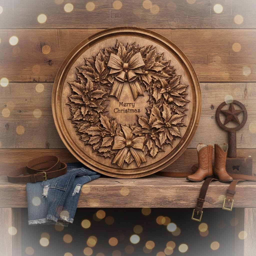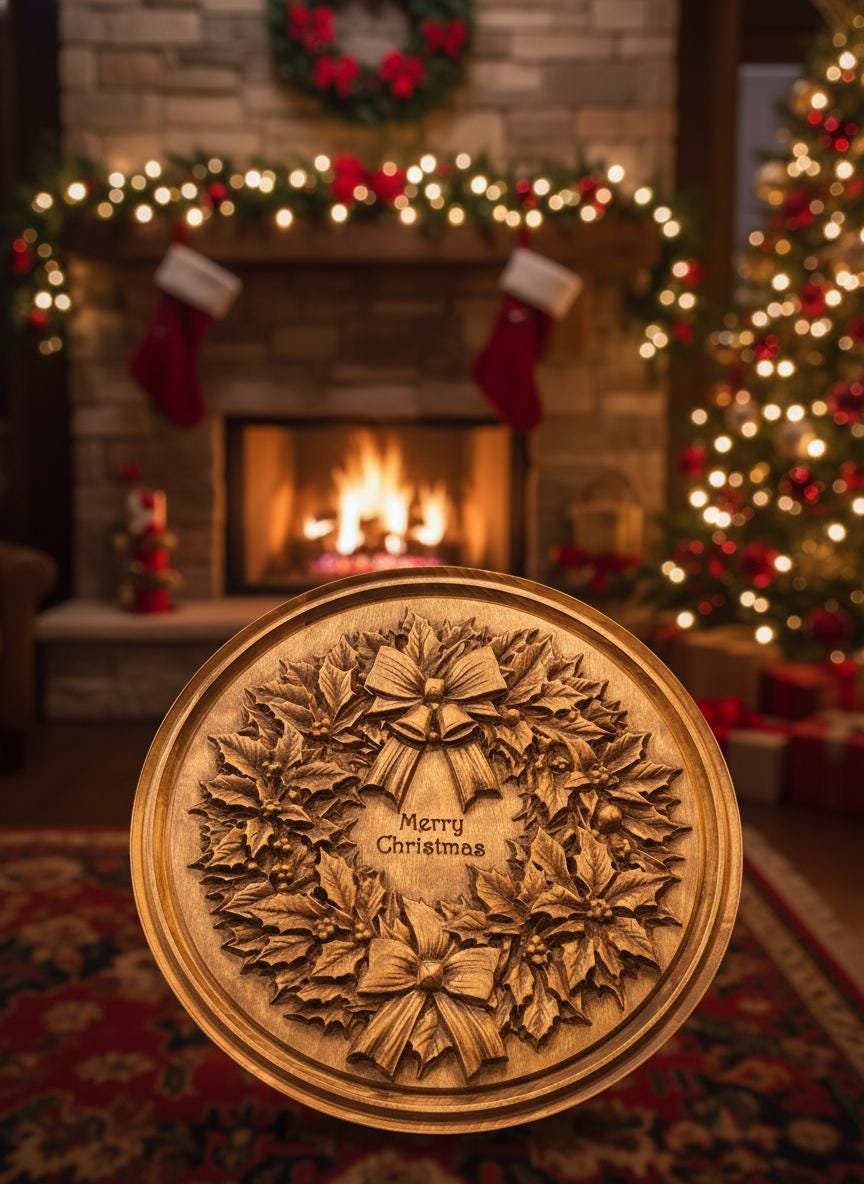 Expertly crafted from high-quality wood, this round plaque features a beautifully deep-carved Christmas wreath design, complete with detailed holly leaves, berries, elegant bows, and charming bells. The central engraving of "Merry Christmas" adds a heartfelt touch, making it an instant classic. The rich wood grain and precise carving showcase superior artistry, ensuring a piece that feels both rustic and refined.