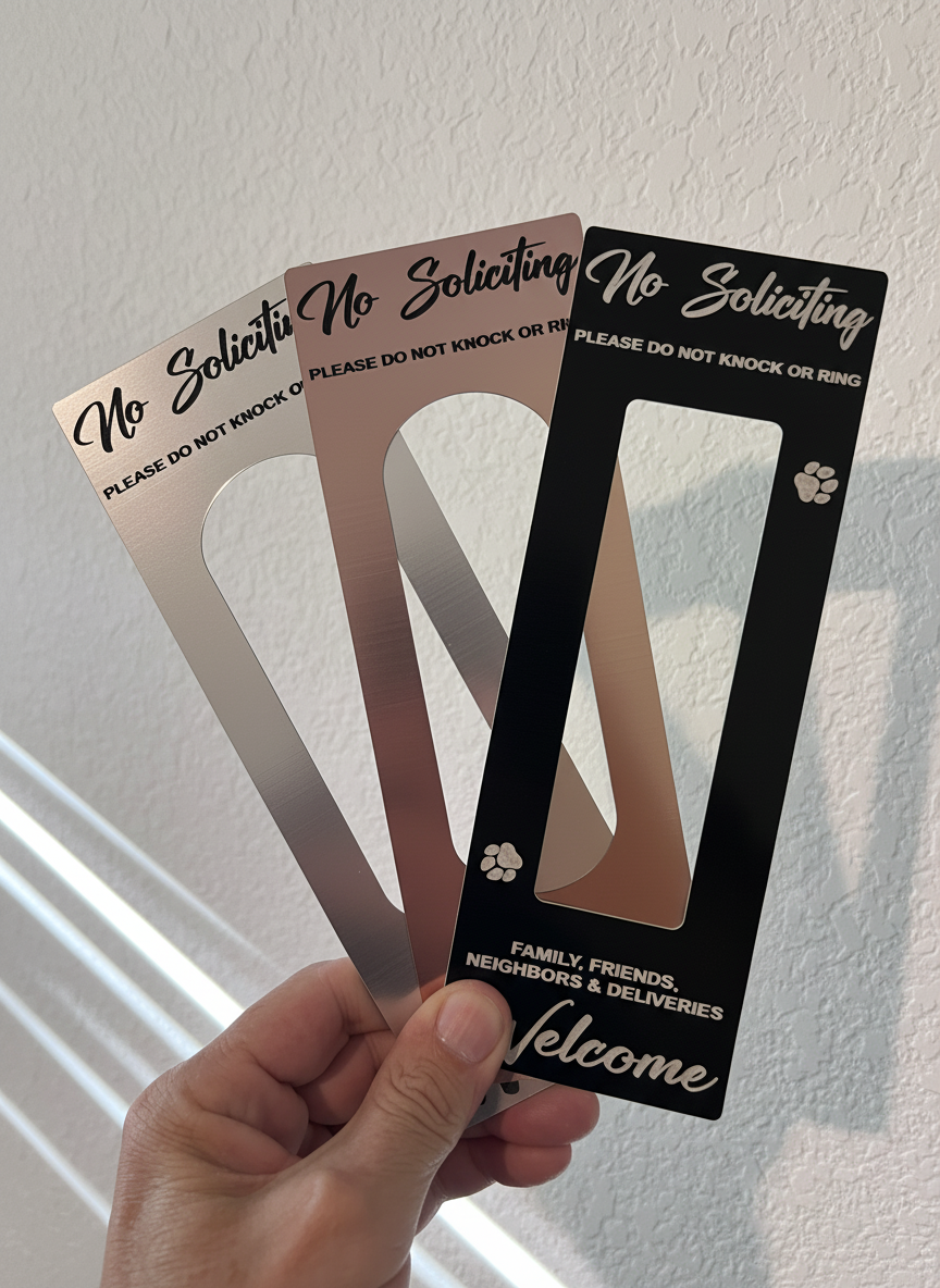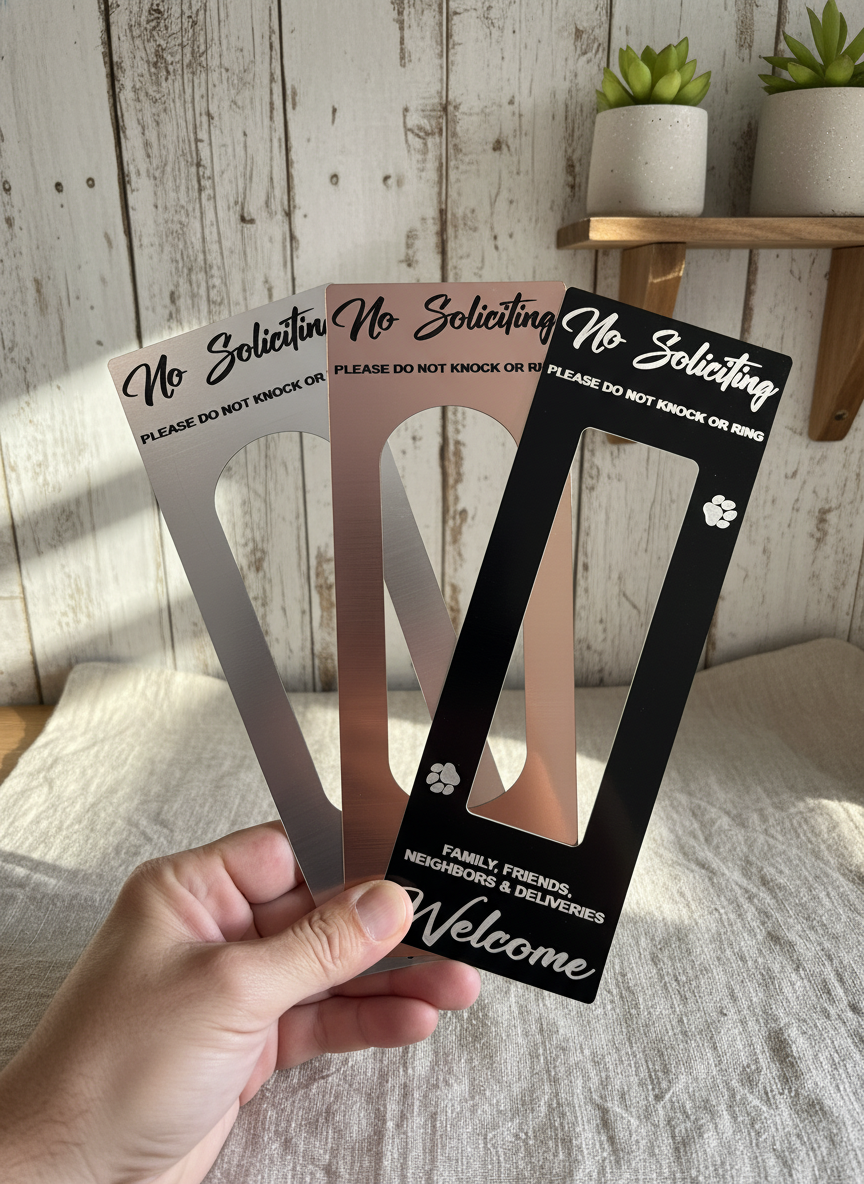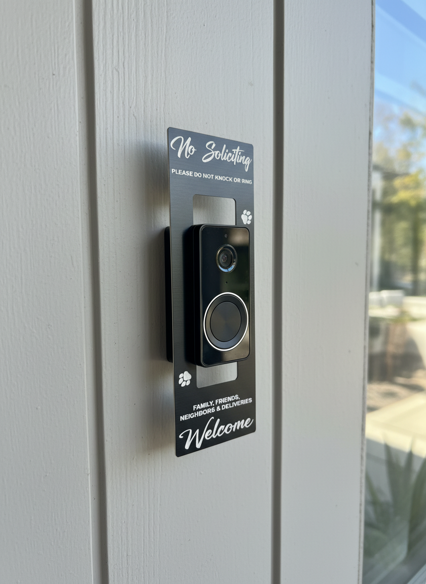 Keep unwanted interruptions at bay while warmly welcoming your loved ones with this sleek Customizable No Soliciting Video Doorbell Surround. Designed to frame your existing video doorbell, this durable sign features a clear “No Soliciting” or message of your choosing, to discourage cold callers, paired with a friendly invitation for family, friends, and deliveries. The charming optional paw print accent adds a touch of personality, making it an absolute must-have for pet owners who want to prevent the chaos of barking dogs caused by unexpected knocks.