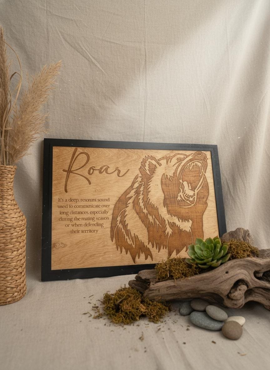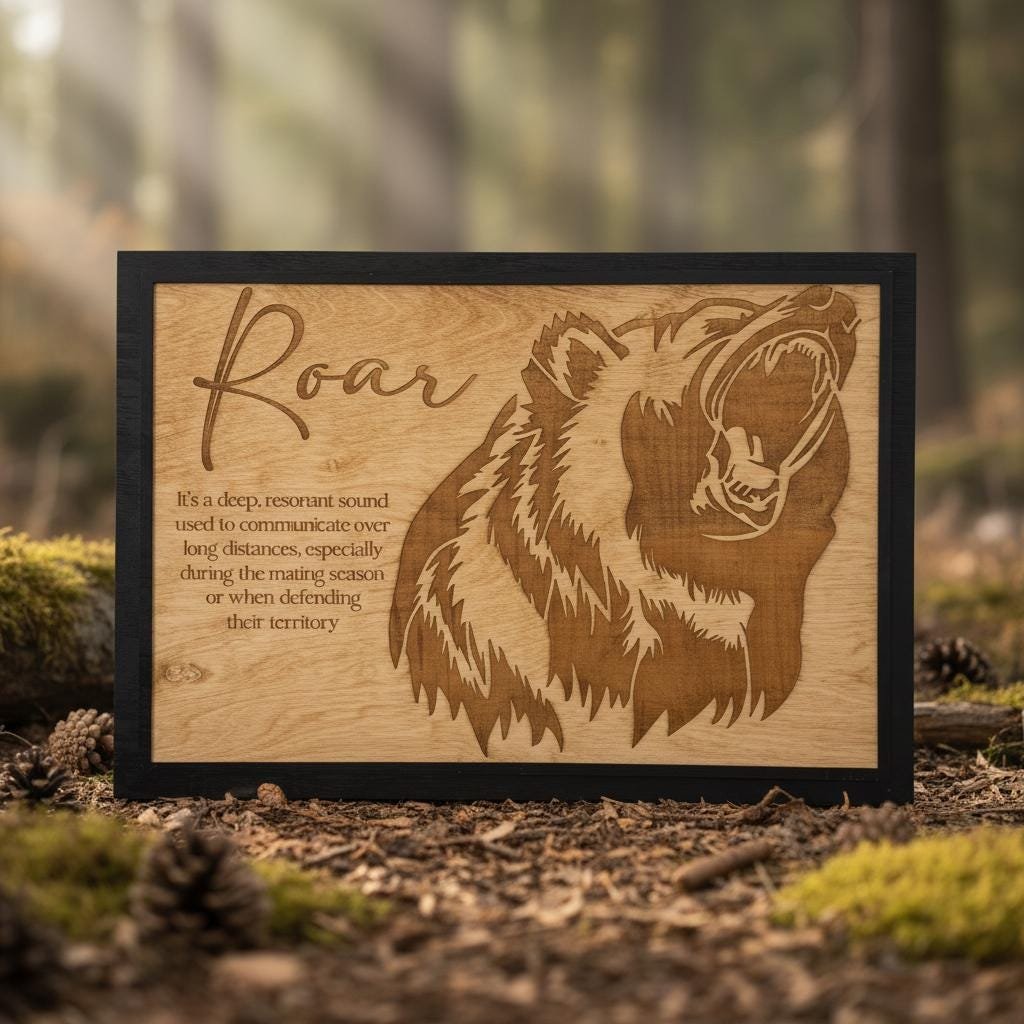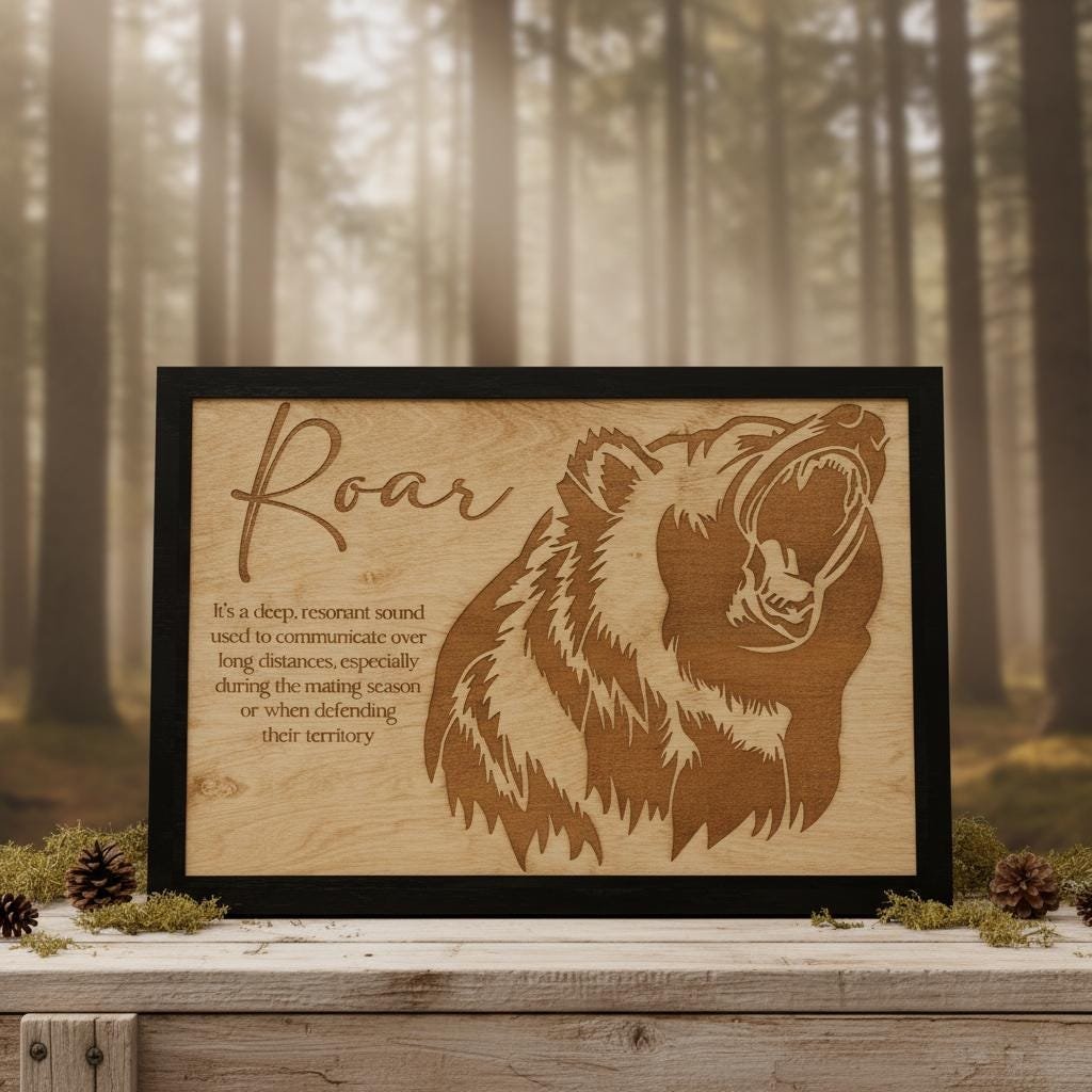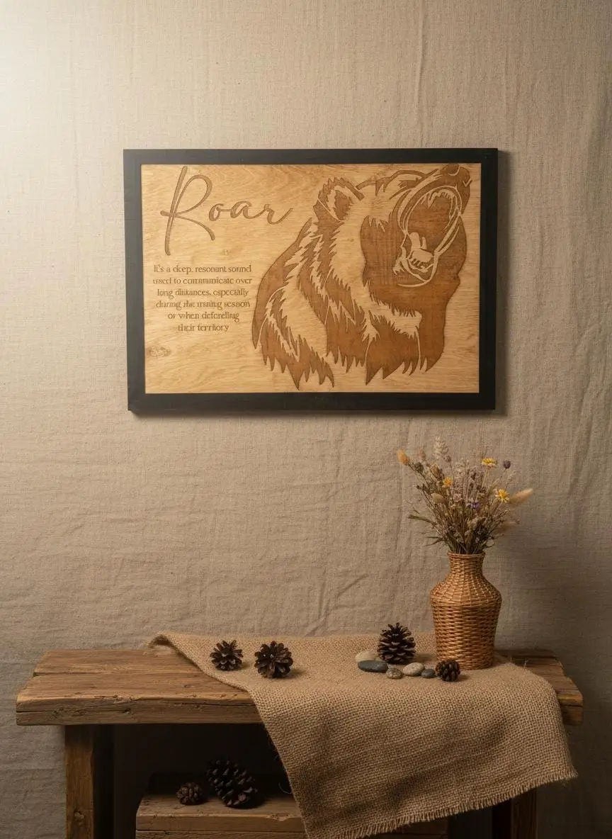 Bring the untamed spirit of the wild into your home with this stunning laser-engraved grizzly bear wall art. Masterfully crafted from high-quality wood, this piece features a fierce, detailed profile of a roaring bear alongside an elegant script title and a dictionary-style definition of “Roar.” The deep, rich tones of the engraving contrast beautifully with the natural wood grain, framed in a sleek black border that adds a modern touch to this rustic masterpiece.