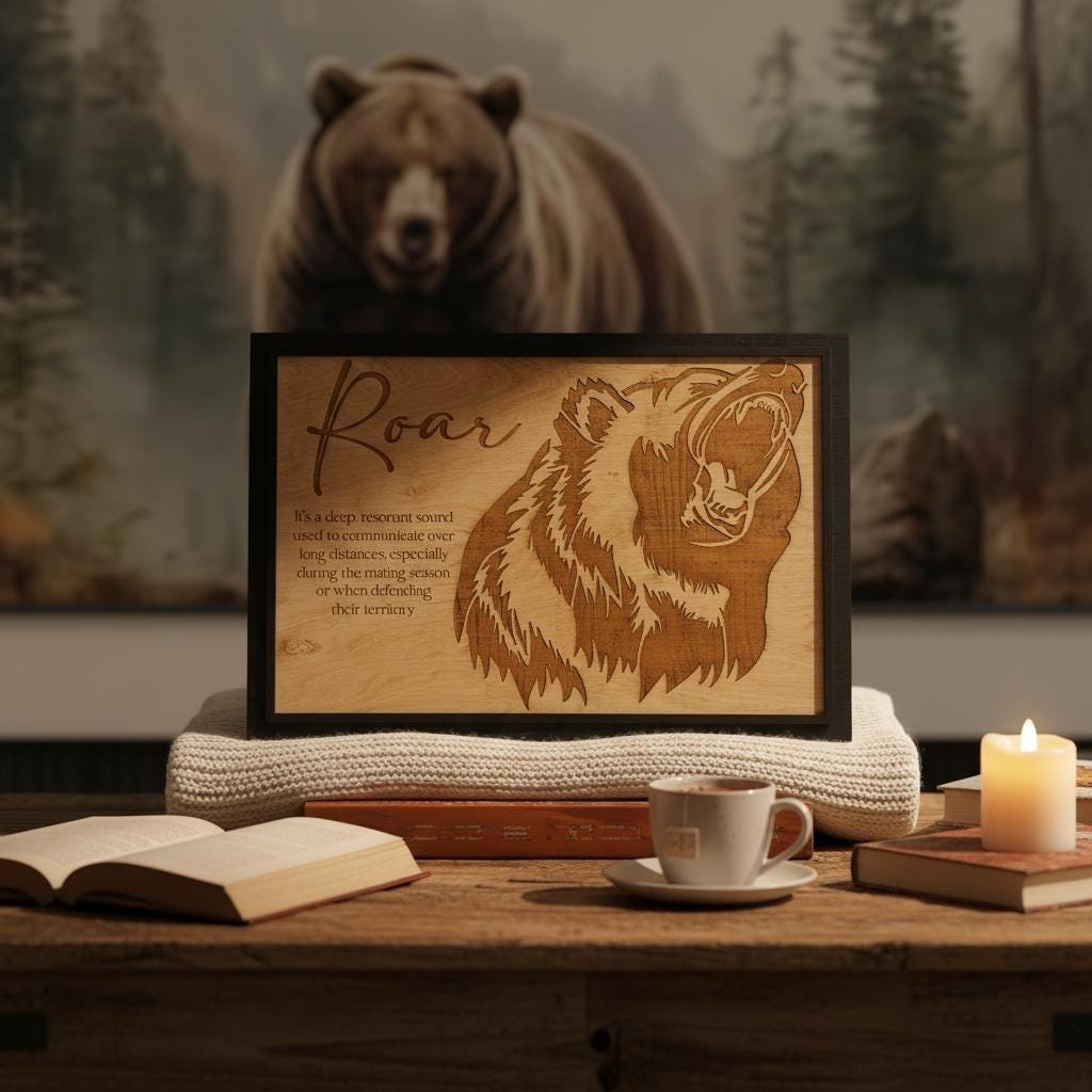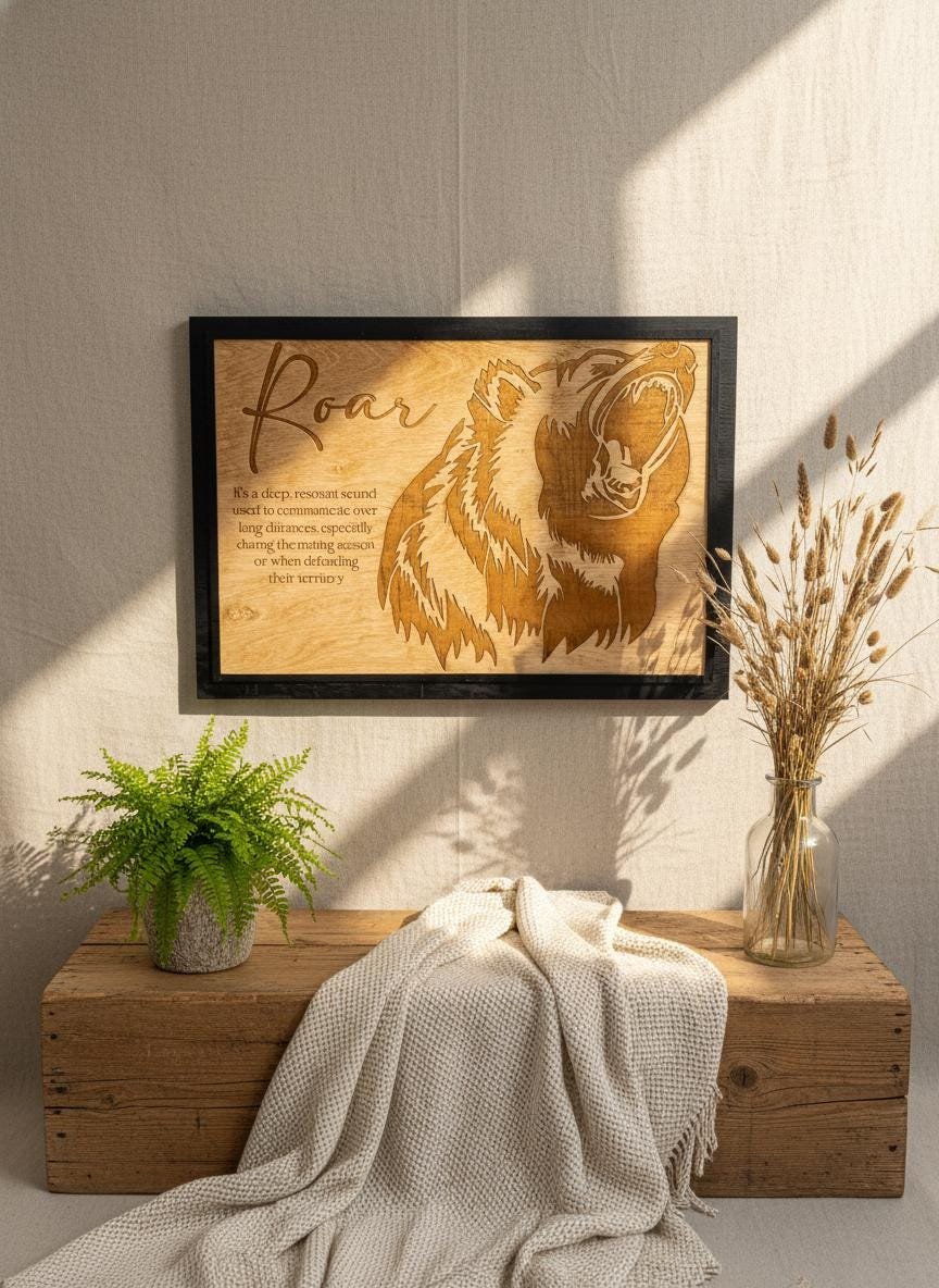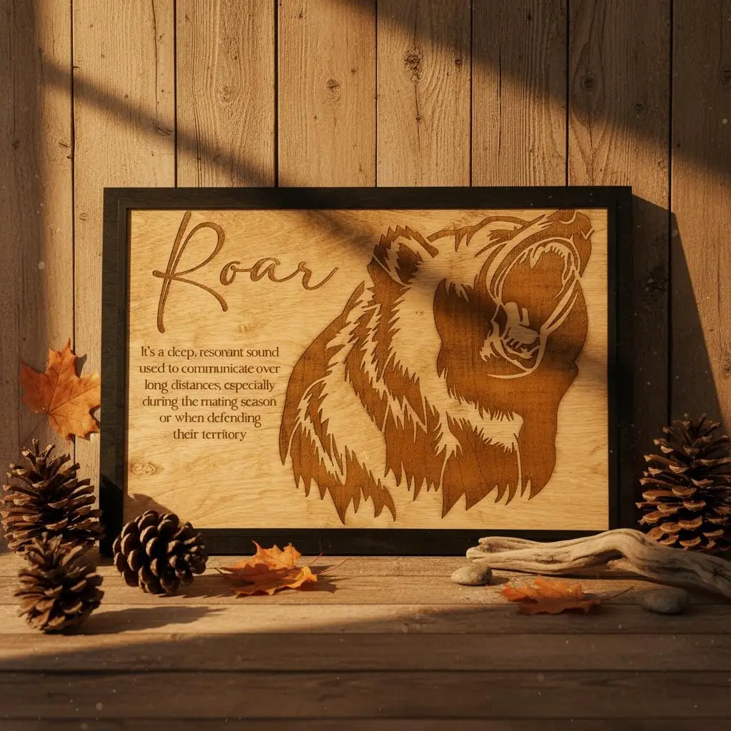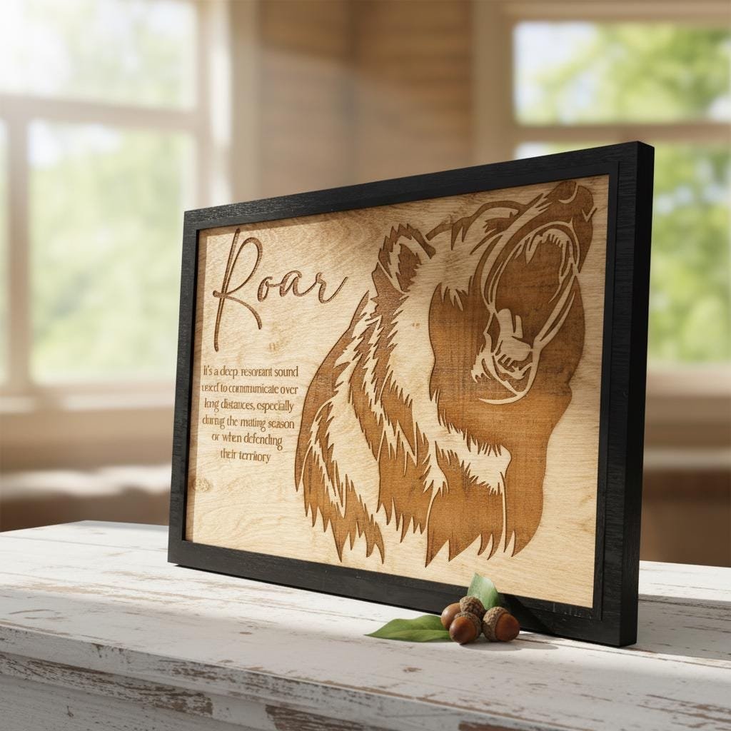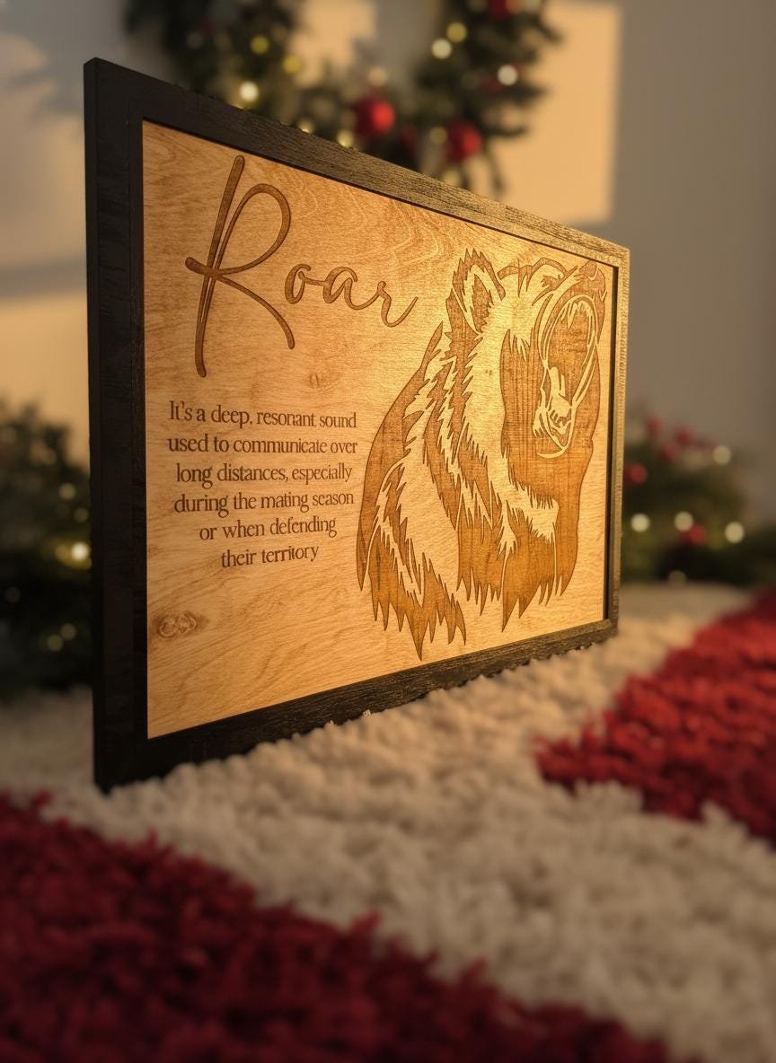 Bring the untamed spirit of the wild into your home with this stunning laser-engraved grizzly bear wall art. Masterfully crafted from high-quality wood, this piece features a fierce, detailed profile of a roaring bear alongside an elegant script title and a dictionary-style definition of “Roar.” The deep, rich tones of the engraving contrast beautifully with the natural wood grain, framed in a sleek black border that adds a modern touch to this rustic masterpiece.