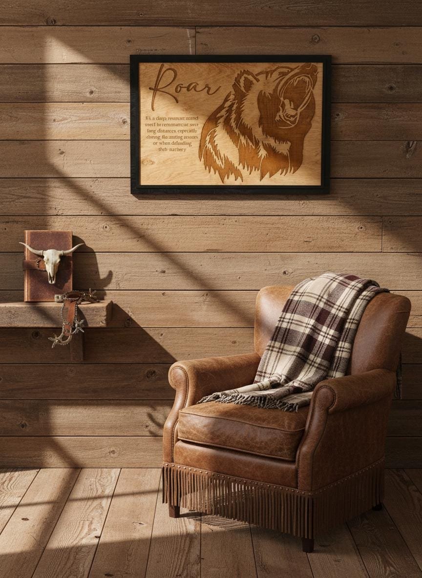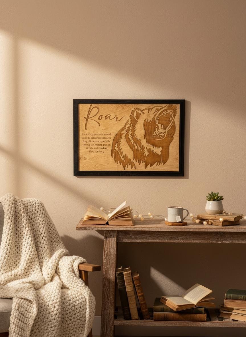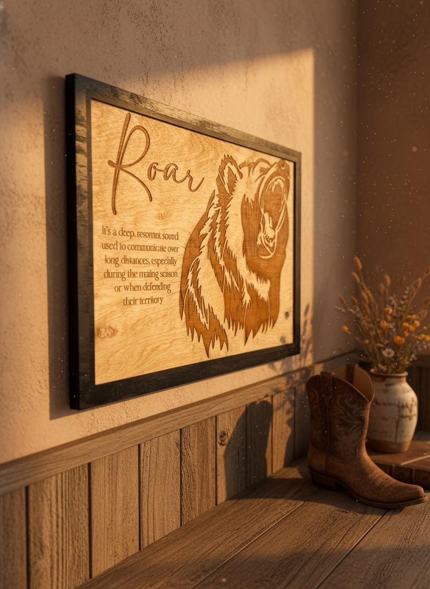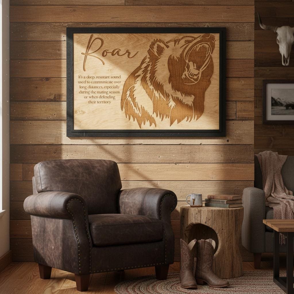 Bring the untamed spirit of the wild into your home with this stunning laser-engraved grizzly bear wall art. Masterfully crafted from high-quality wood, this piece features a fierce, detailed profile of a roaring bear alongside an elegant script title and a dictionary-style definition of “Roar.” The deep, rich tones of the engraving contrast beautifully with the natural wood grain, framed in a sleek black border that adds a modern touch to this rustic masterpiece.