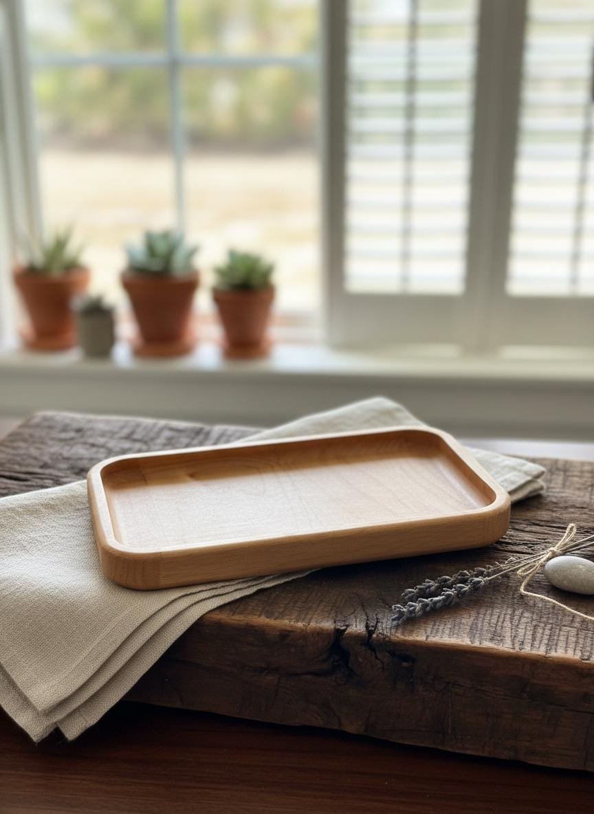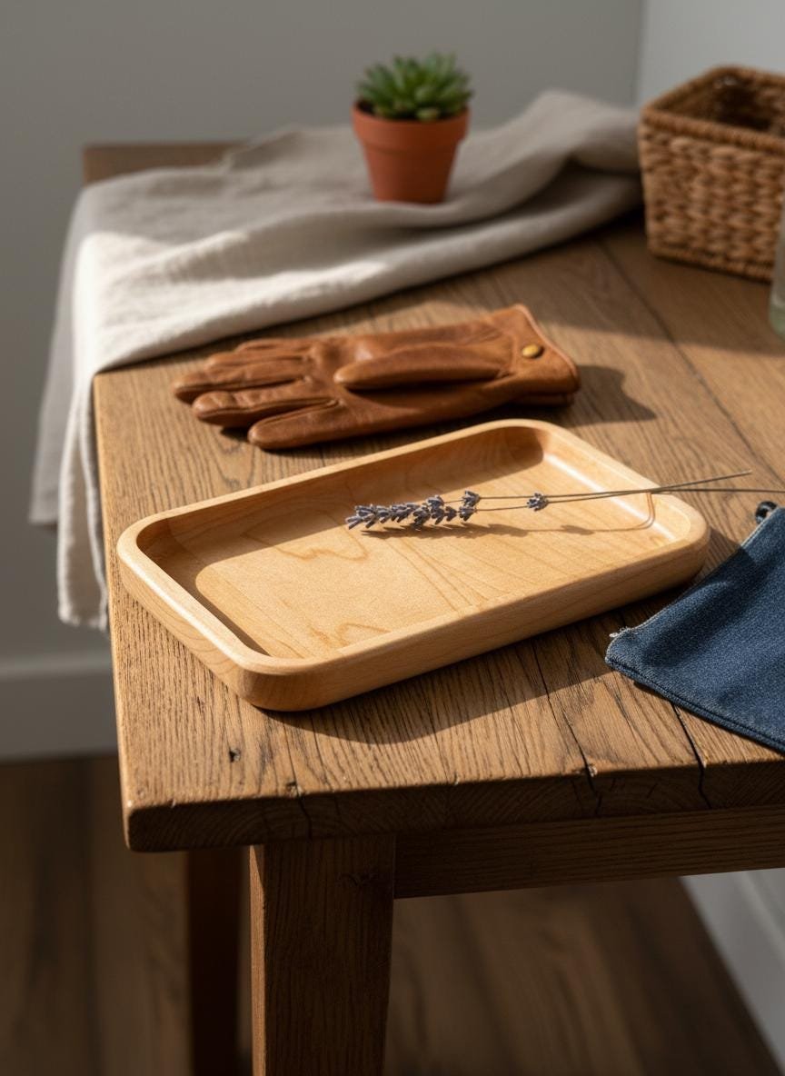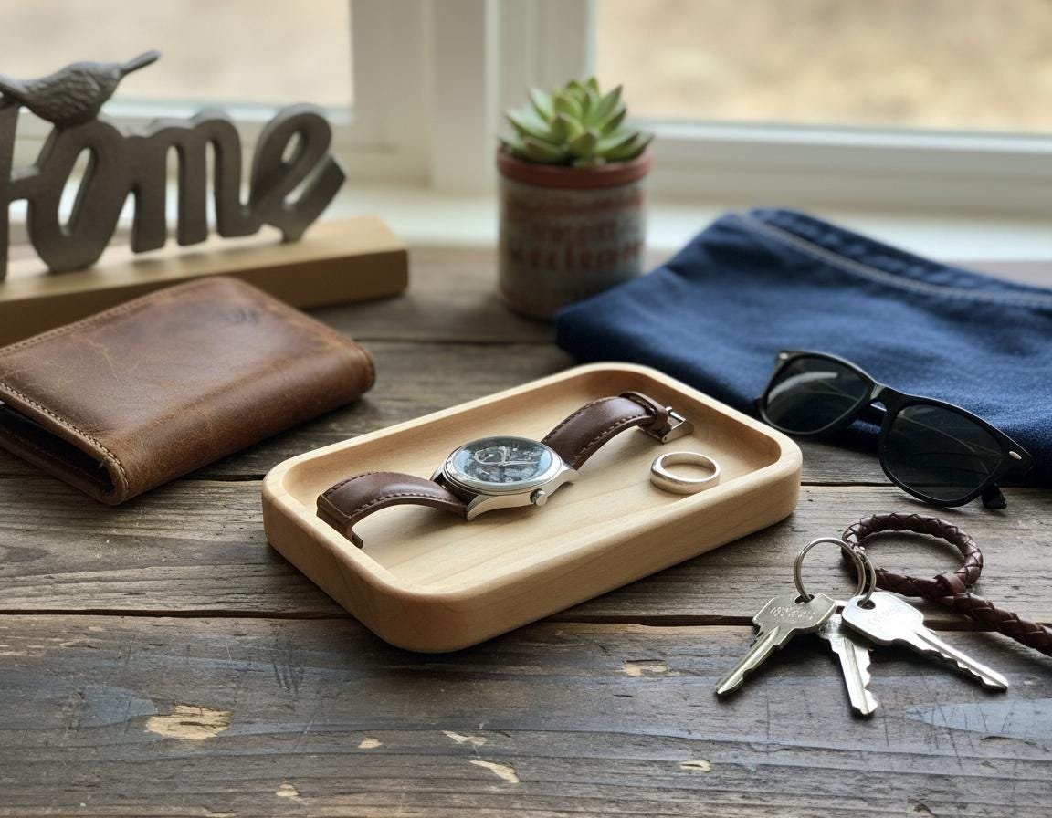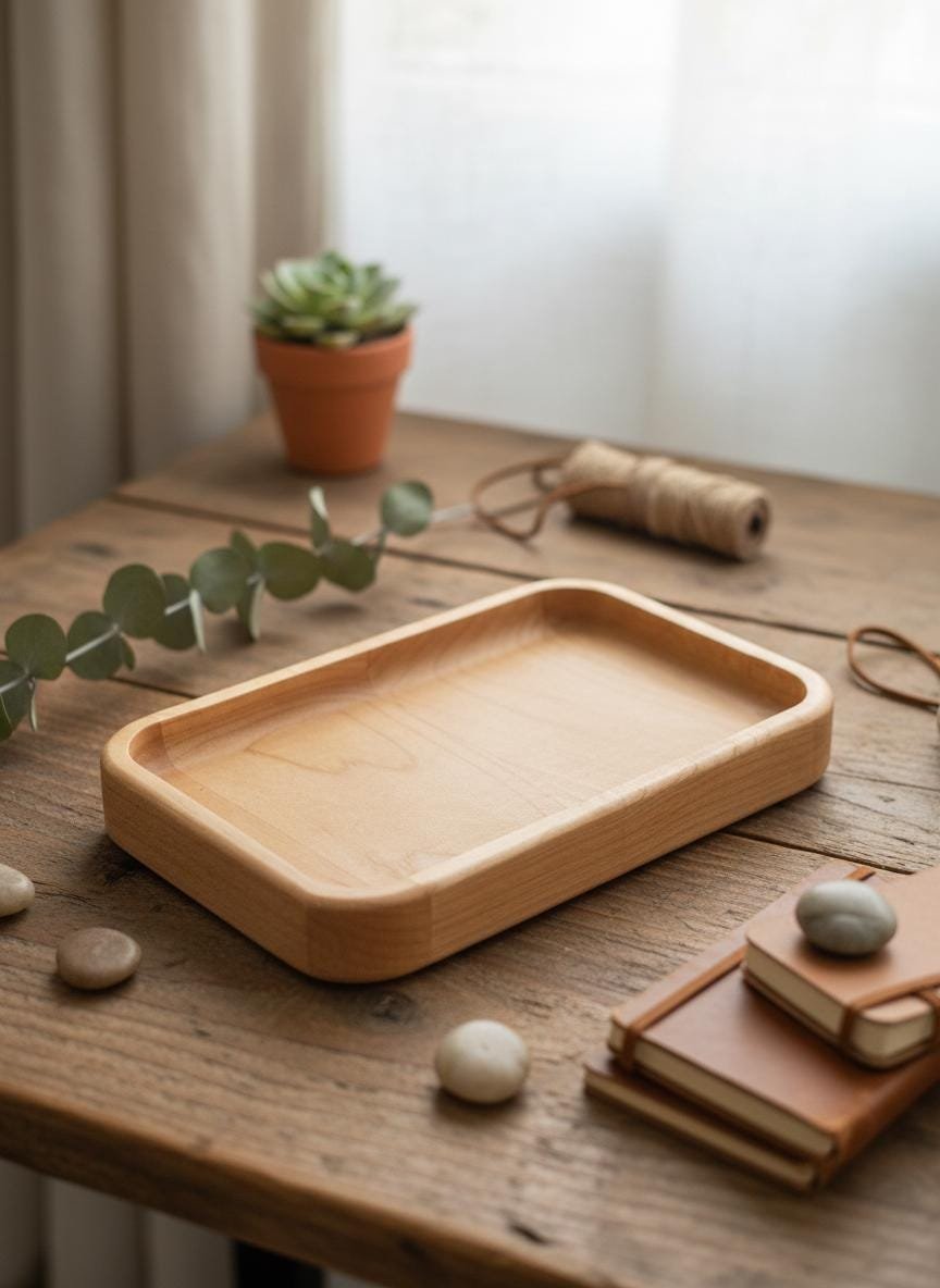 Keep your daily essentials organized and accessible with this beautifully handcrafted solid maple wood valet tray. Made from natural, light-toned maple wood with smoothly rounded edges, this minimalist catch-all dish is perfect for decluttering your nightstand, entryway table, desk, or dresser. Its simple yet elegant design complements any rustic, cozy, or modern home decor.