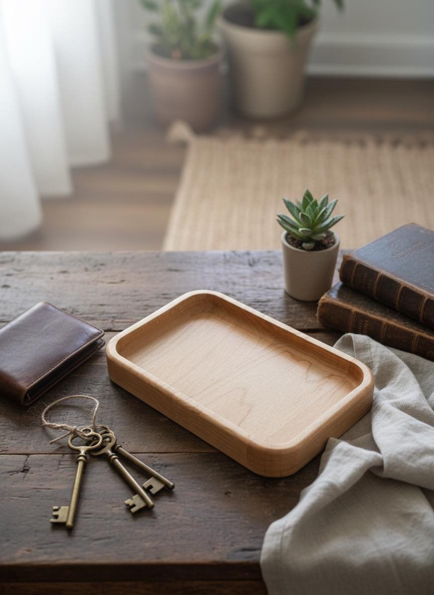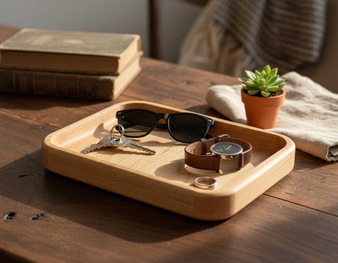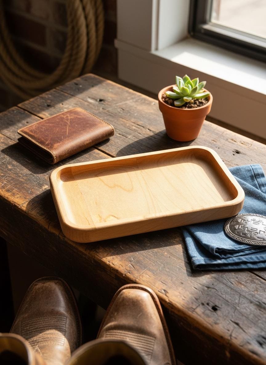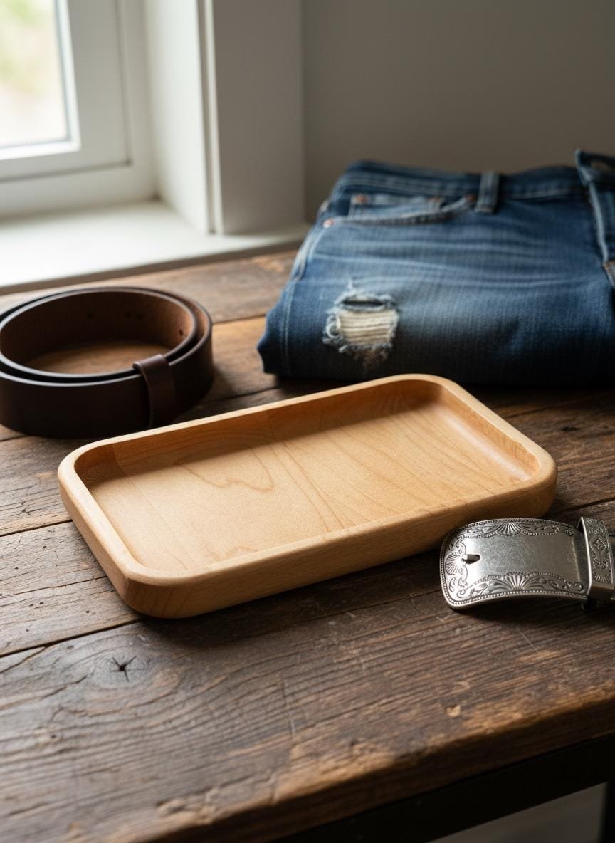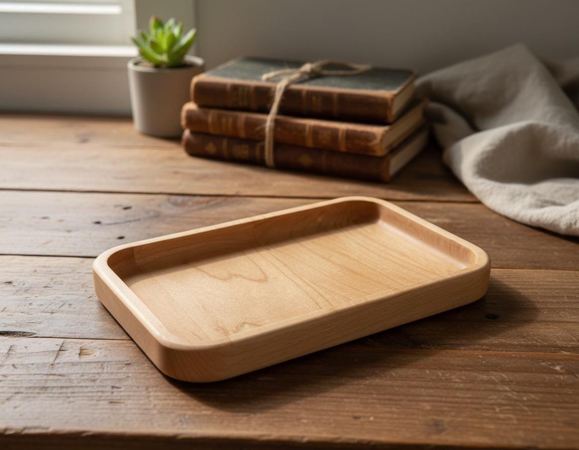 Keep your daily essentials organized and accessible with this beautifully handcrafted solid maple wood valet tray. Made from natural, light-toned maple wood with smoothly rounded edges, this minimalist catch-all dish is perfect for decluttering your nightstand, entryway table, desk, or dresser. Its simple yet elegant design complements any rustic, cozy, or modern home decor.