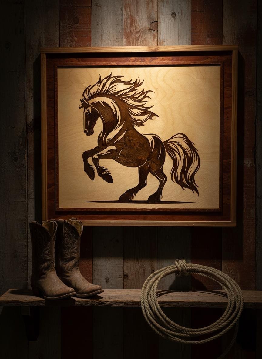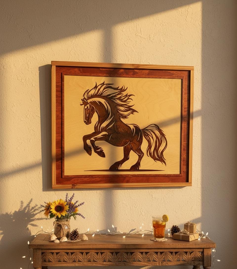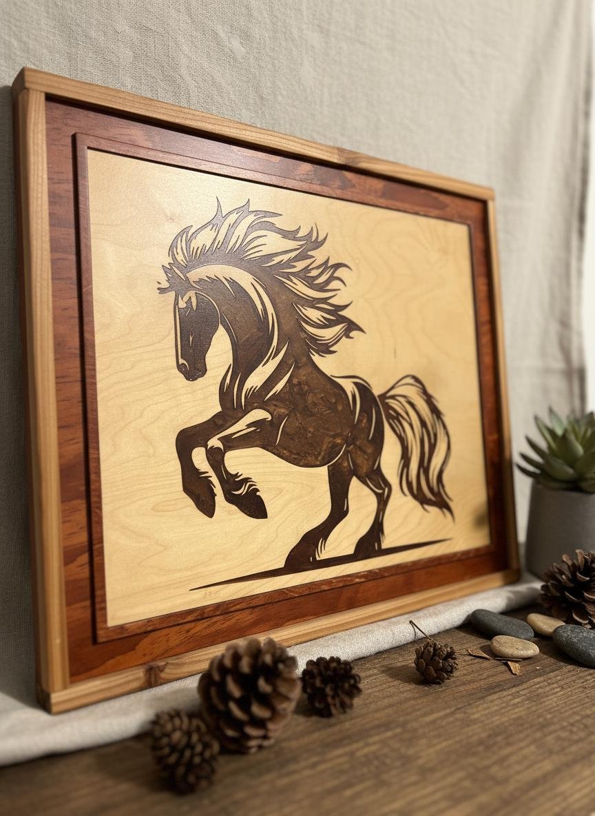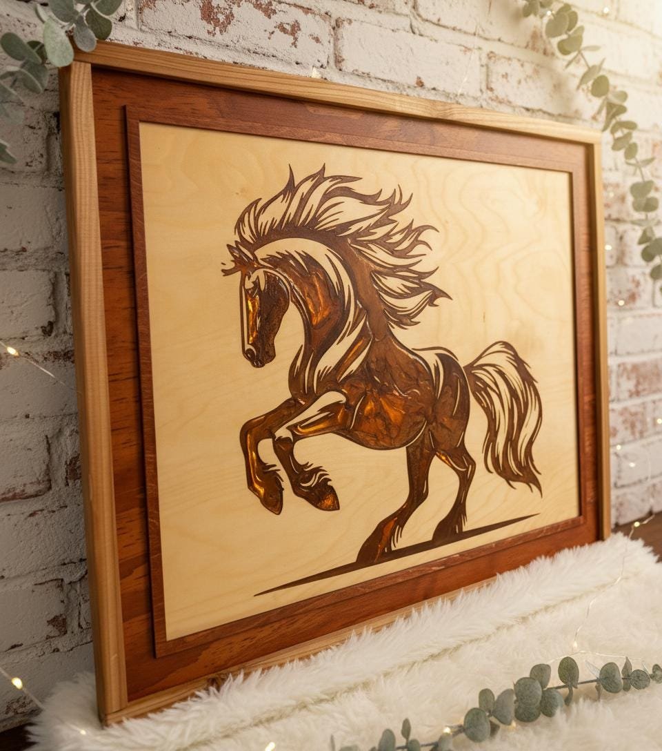 Capture the untamed spirit of the wild with this stunning Laser Engraved Stallion Wall Art. Expertly crafted, this piece features a dynamic rearing horse etched deep into high-quality wood, filled with a rich, dark resin inlay that creates a striking contrast against the natural grain. The intricate details of the mane and muscles are highlighted by the glossy finish of the resin, bringing the artwork to life within its handcrafted, two-tone wooden frame.
