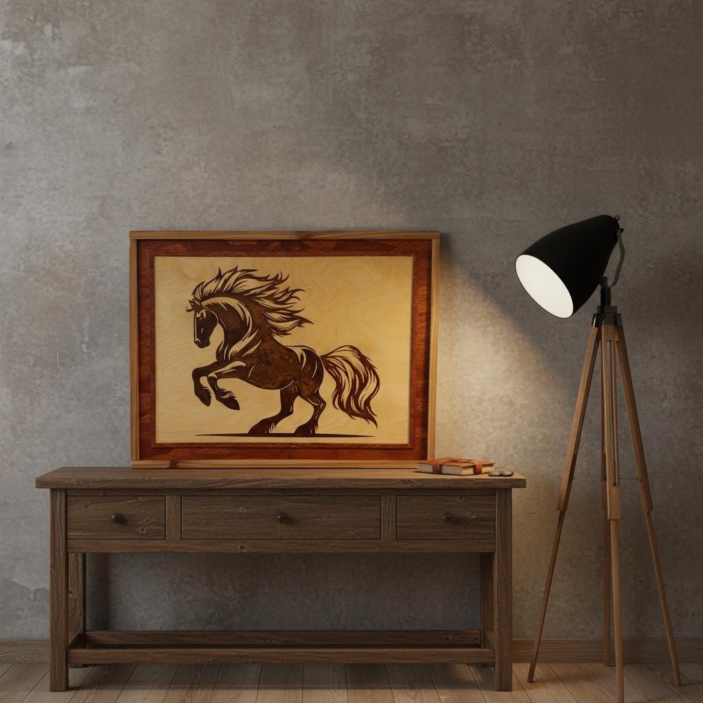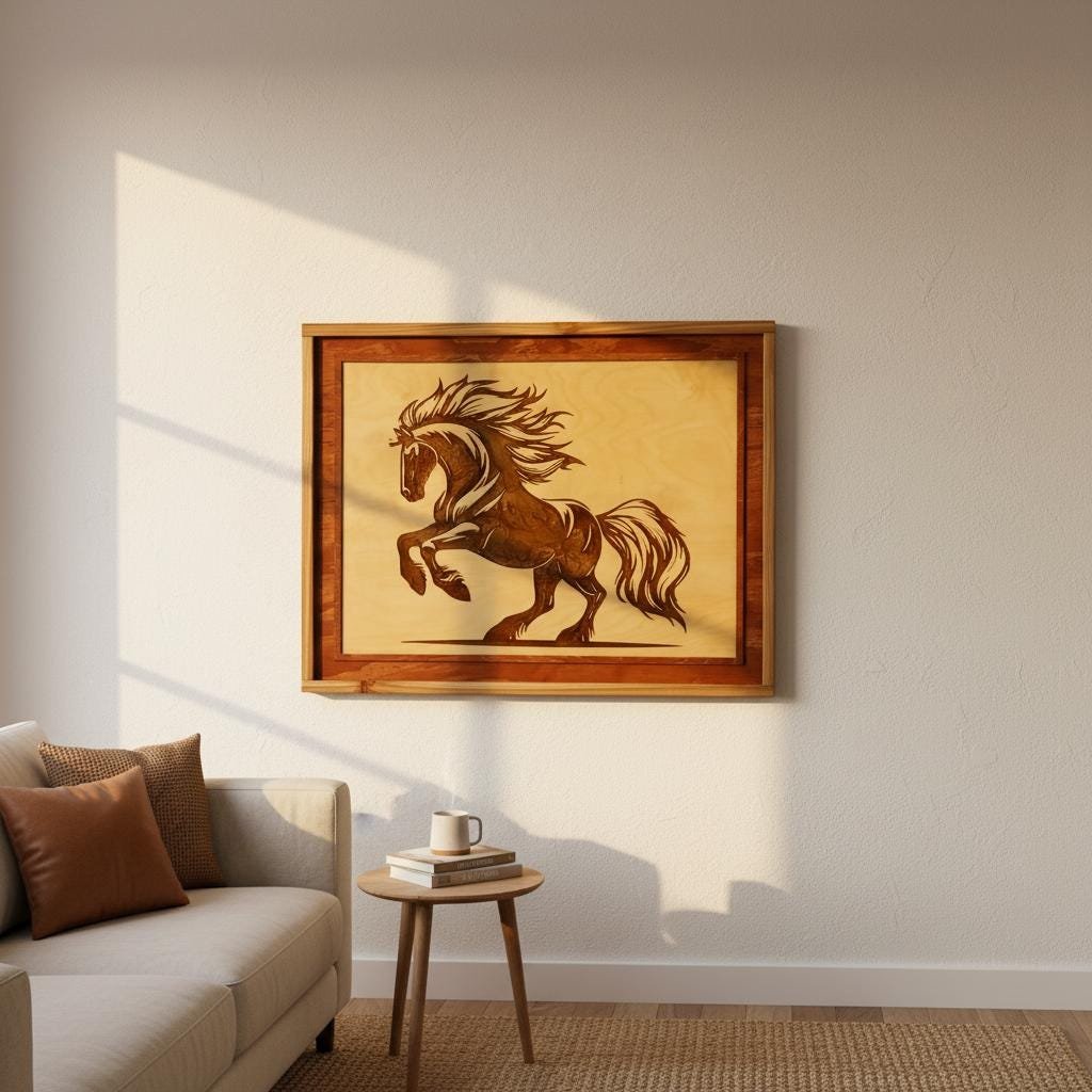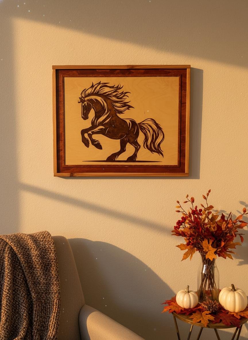 Capture the untamed spirit of the wild with this stunning Laser Engraved Stallion Wall Art. Expertly crafted, this piece features a dynamic rearing horse etched deep into high-quality wood, filled with a rich, dark resin inlay that creates a striking contrast against the natural grain. The intricate details of the mane and muscles are highlighted by the glossy finish of the resin, bringing the artwork to life within its handcrafted, two-tone wooden frame.