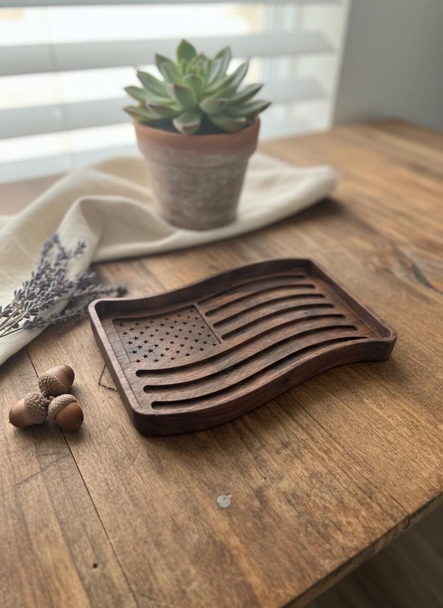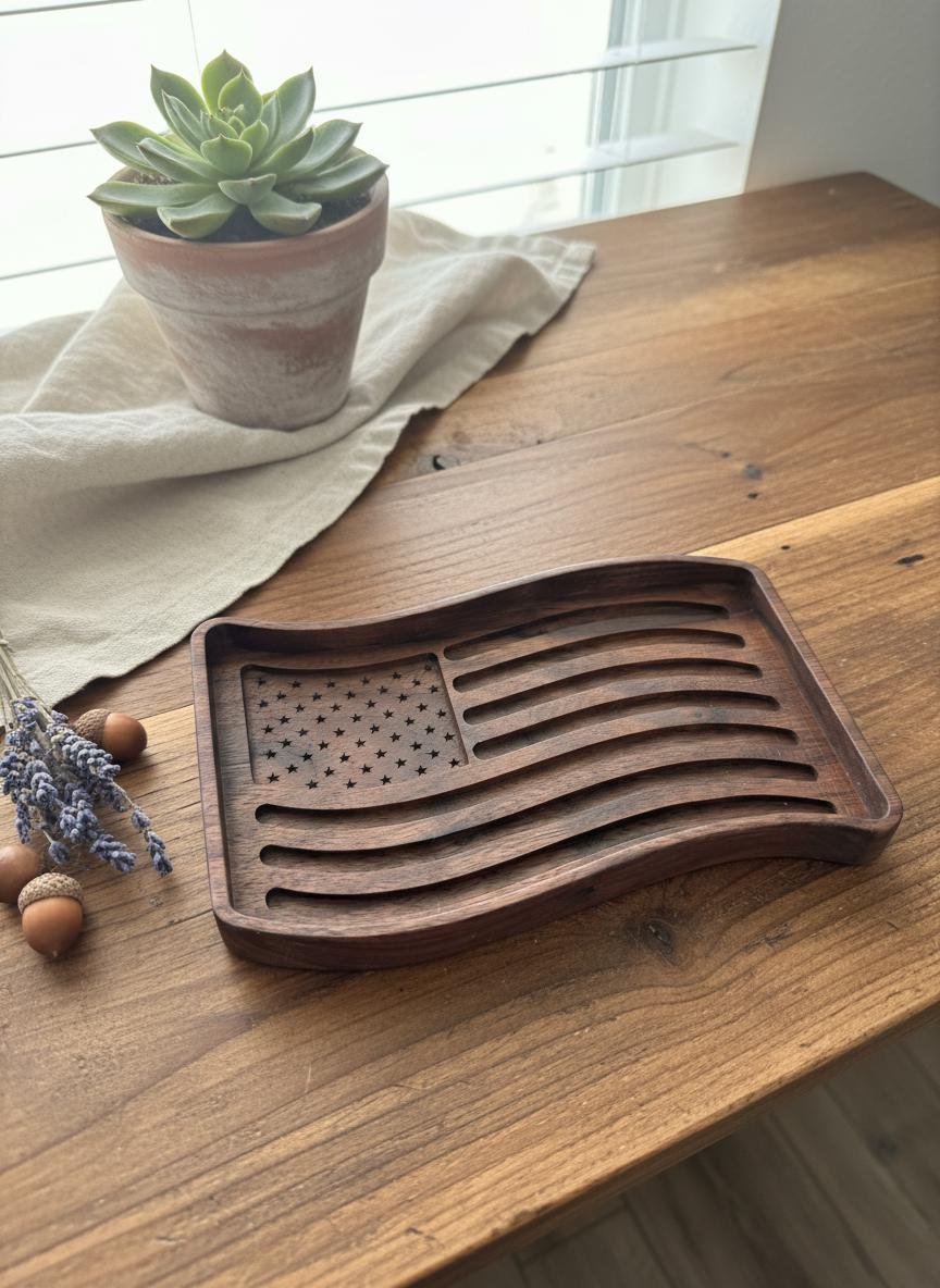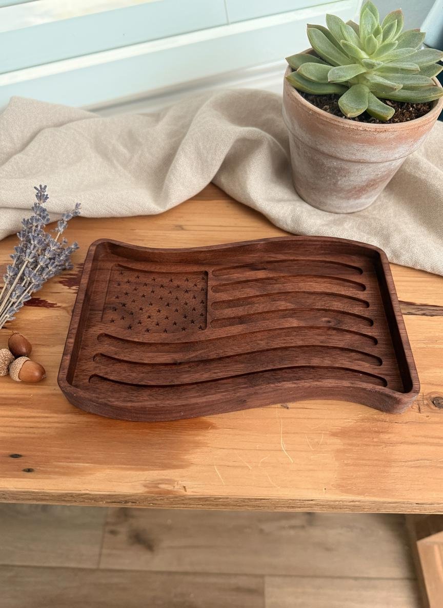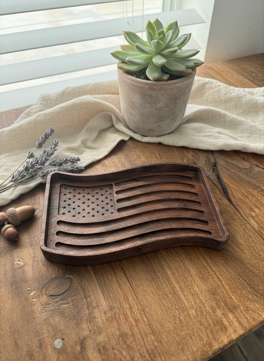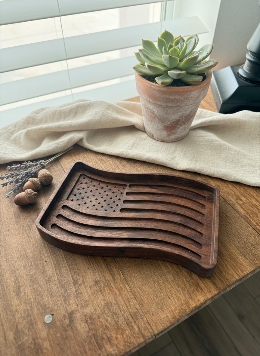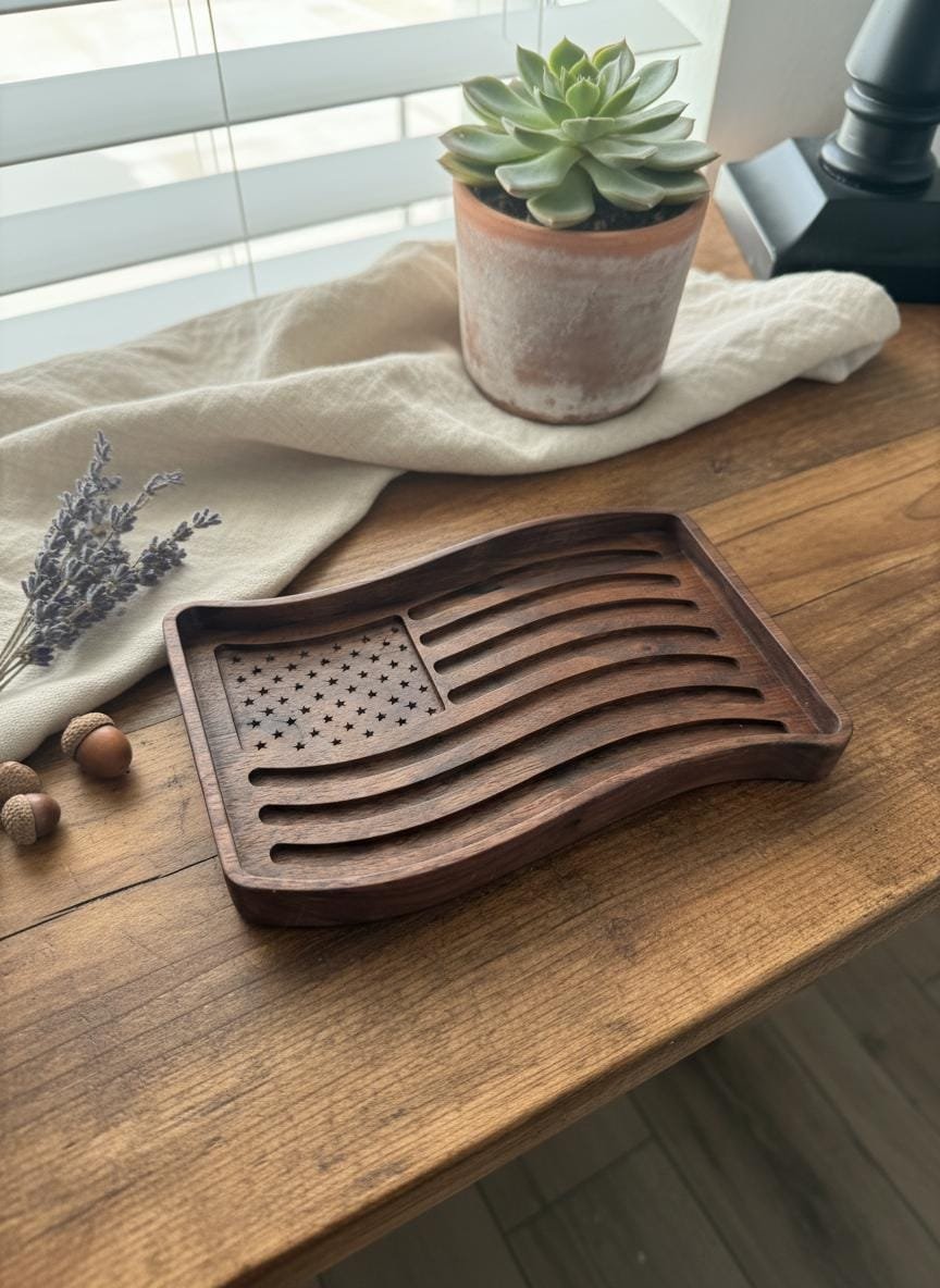 Celebrate your patriotism with this beautifully wooden American flag tray. Crafted from rich, dark walnut wood, this unique piece features intricately carved stars and waving stripes, bringing a touch of rustic charm to any space. Perfect as a catchall dish for keys, coins, or jewelry in your entryway or office, it also serves as a striking decorative accent on its own.