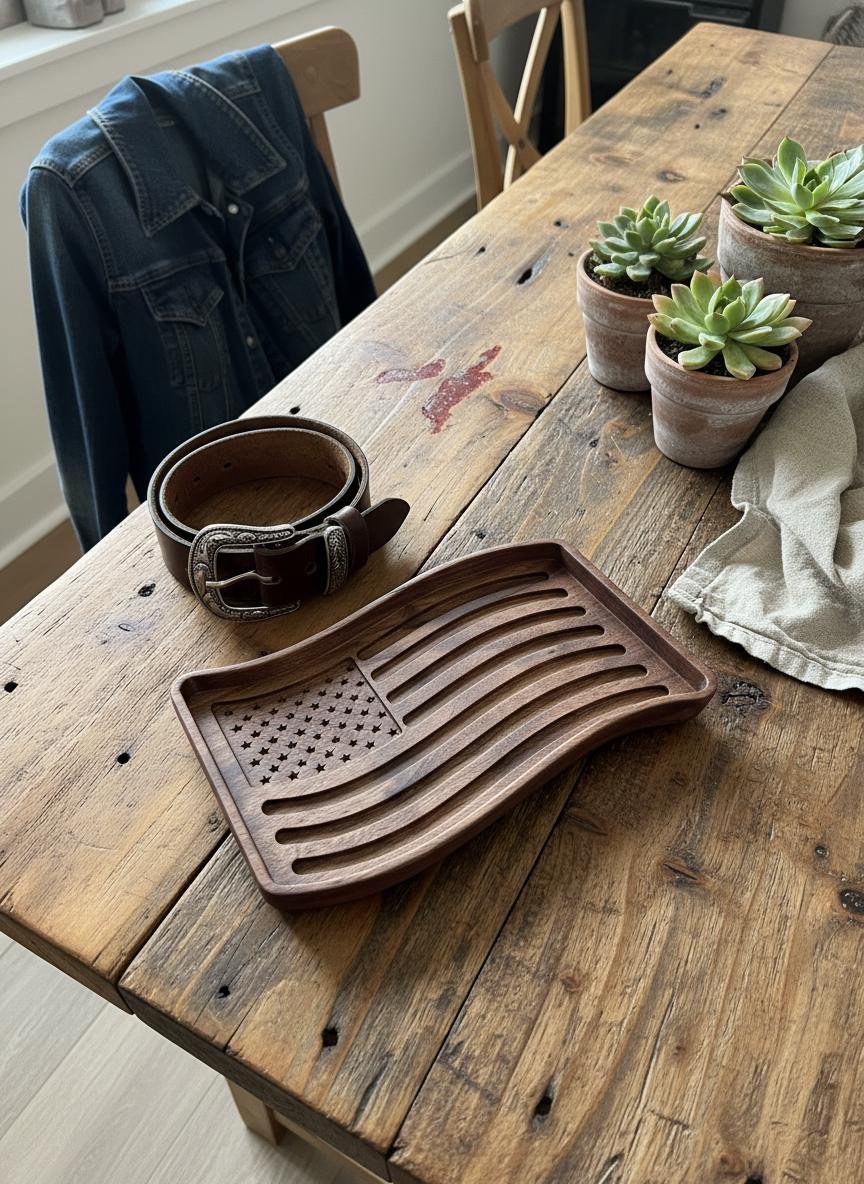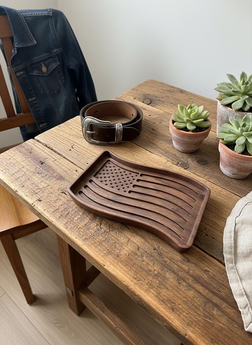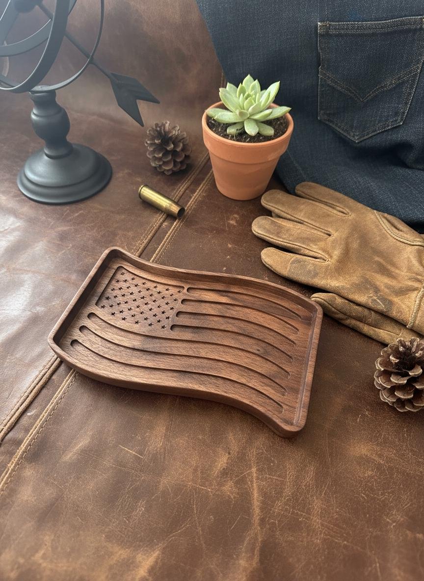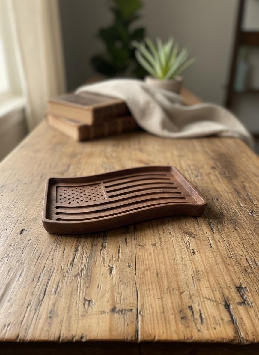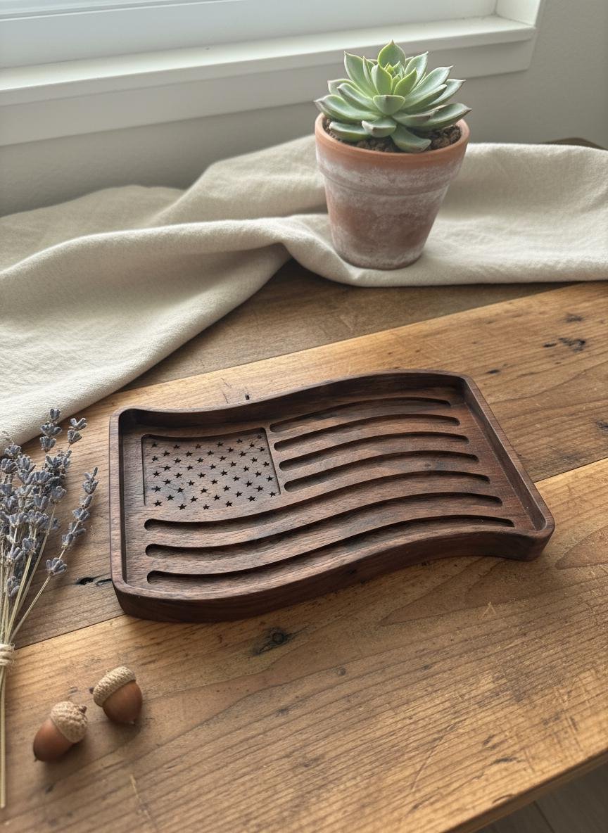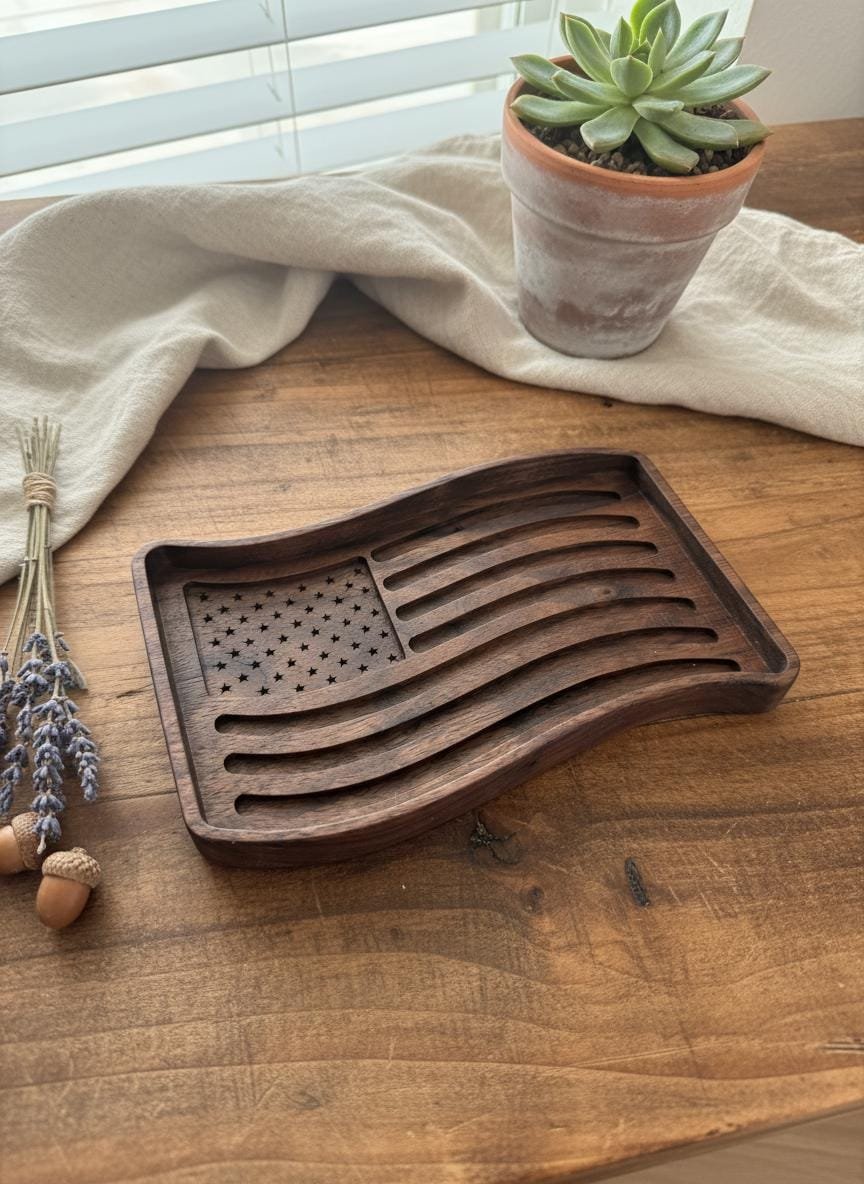 Celebrate your patriotism with this beautifully wooden American flag tray. Crafted from rich, dark walnut wood, this unique piece features intricately carved stars and waving stripes, bringing a touch of rustic charm to any space. Perfect as a catchall dish for keys, coins, or jewelry in your entryway or office, it also serves as a striking decorative accent on its own.