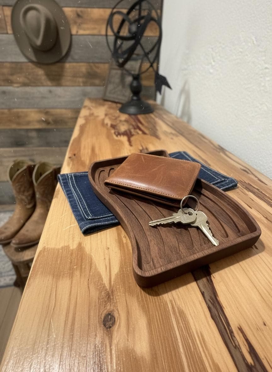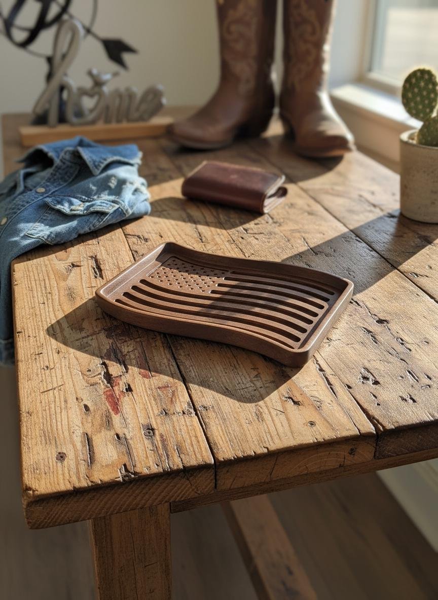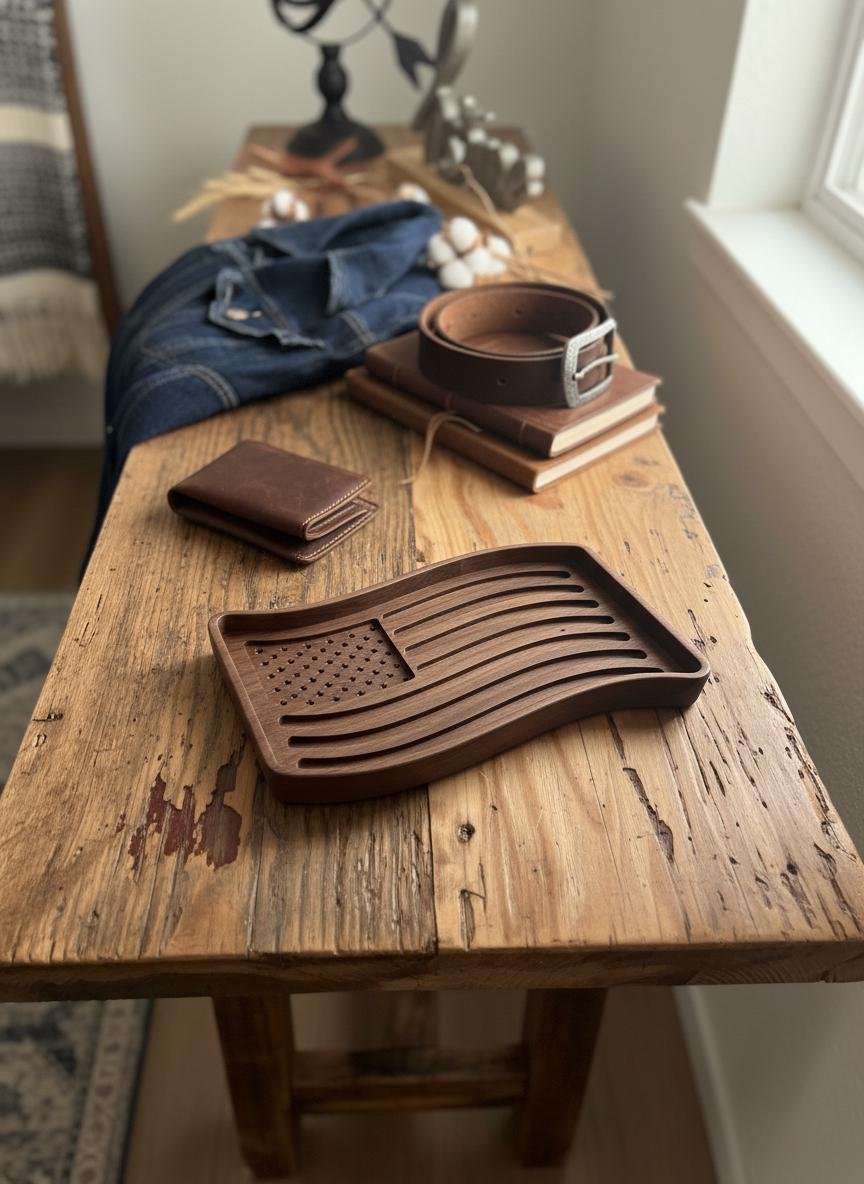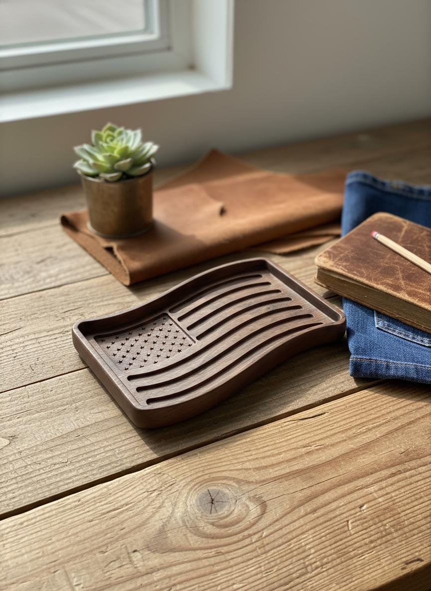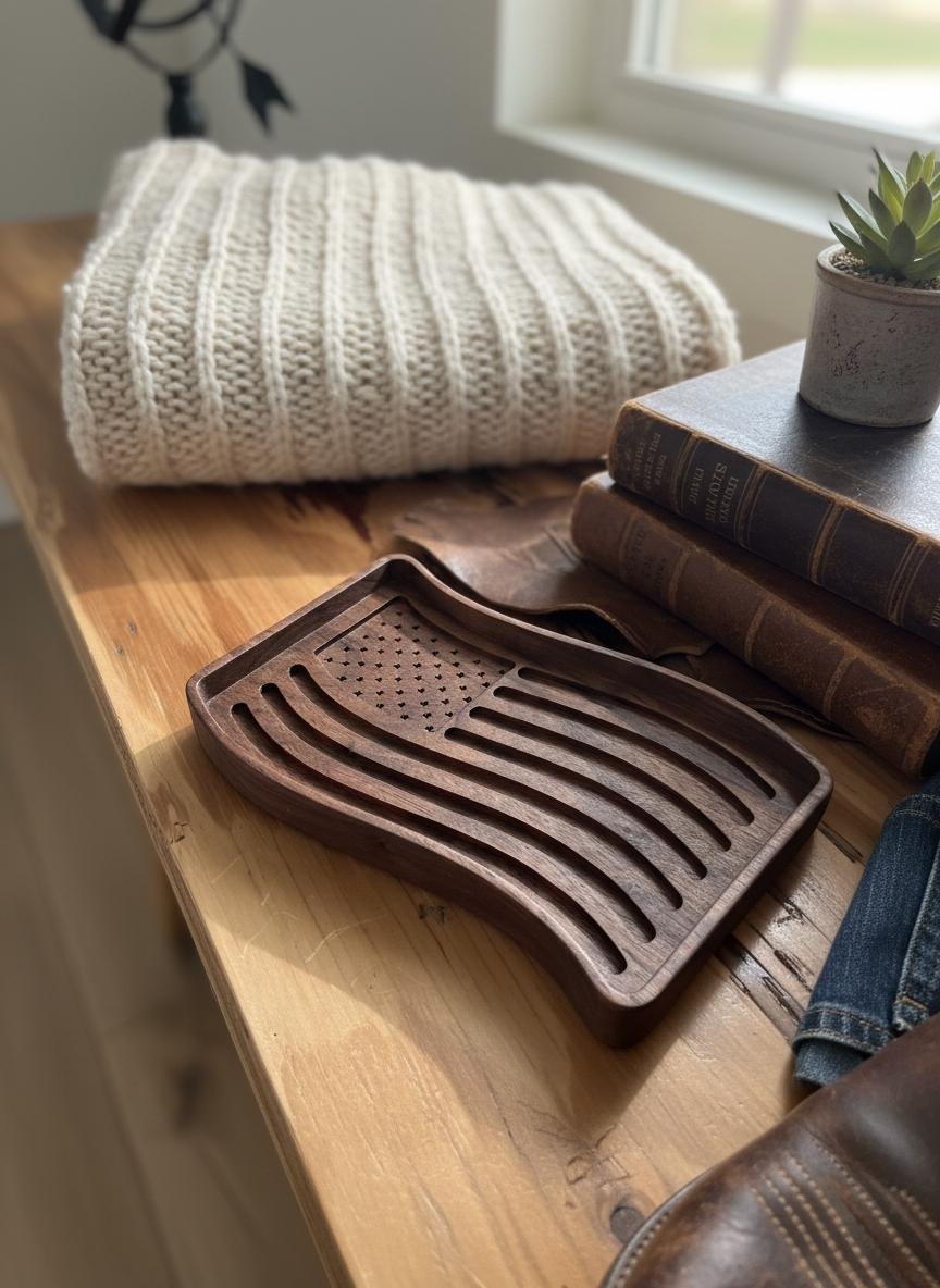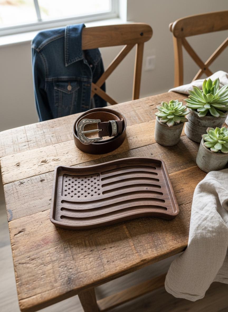 Celebrate your patriotism with this beautifully wooden American flag tray. Crafted from rich, dark walnut wood, this unique piece features intricately carved stars and waving stripes, bringing a touch of rustic charm to any space. Perfect as a catchall dish for keys, coins, or jewelry in your entryway or office, it also serves as a striking decorative accent on its own.